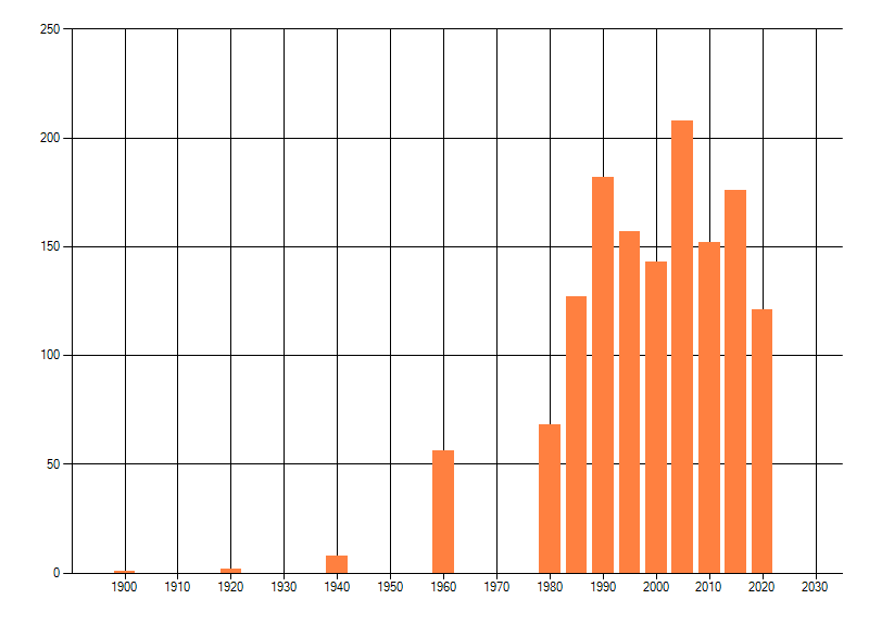 Het aantal atlasblokken (5x5 km) waarin de soort is gemeld binnen een periode van vijf jaar (vanaf 1980) of twintig jaar. Niet gecorrigeerd voor waarnemersinspanning en het aantal doorgegeven waarnemingen kan sterk variëren per periode, dus een trend in verspreiding kan hier niet direct uit worden afgelezen. Het opgegeven jaartal is het eerste jaar van de periode. Bron: gevalideerde waarnemingen uit de NDFF.