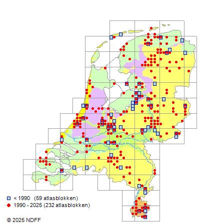 Het aantal atlasblokken (5x5 km) waarin de soort is gemeld binnen een periode van vijf jaar (vanaf 1980) of twintig jaar. Niet gecorrigeerd voor waarnemersinspanning en het aantal doorgegeven waarnemingen kan sterk variëren per periode, dus een trend in verspreiding kan hier niet direct uit worden afgelezen. Het opgegeven jaartal is het eerste jaar van de periode. Bron: gevalideerde waarnemingen uit de NDFF.