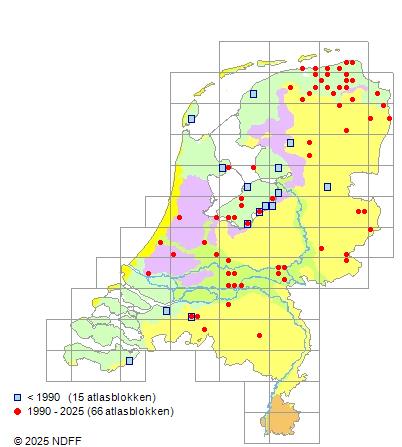 Het aantal atlasblokken (5x5 km) waarin de soort is gemeld binnen een periode van vijf jaar (vanaf 1980) of twintig jaar. Niet gecorrigeerd voor waarnemersinspanning en het aantal doorgegeven waarnemingen kan sterk variëren per periode, dus een trend in verspreiding kan hier niet direct uit worden afgelezen. Het opgegeven jaartal is het eerste jaar van de periode. Bron: gevalideerde waarnemingen uit de NDFF.