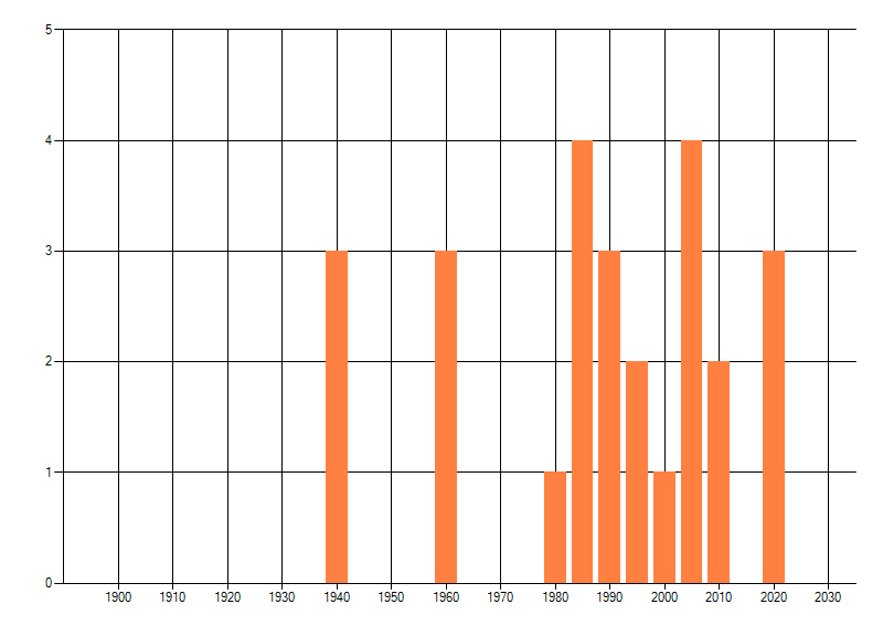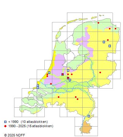 Het aantal atlasblokken (5x5 km) waarin de soort is gemeld binnen een periode van vijf jaar (vanaf 1980) of twintig jaar. Niet gecorrigeerd voor waarnemersinspanning en het aantal doorgegeven waarnemingen kan sterk variëren per periode, dus een trend in verspreiding kan hier niet direct uit worden afgelezen. Het opgegeven jaartal is het eerste jaar van de periode. Bron: gevalideerde waarnemingen uit de NDFF.