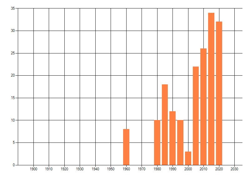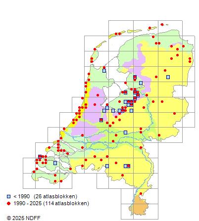 Het aantal atlasblokken (5x5 km) waarin de soort is gemeld binnen een periode van vijf jaar (vanaf 1980) of twintig jaar. Niet gecorrigeerd voor waarnemersinspanning en het aantal doorgegeven waarnemingen kan sterk variëren per periode, dus een trend in verspreiding kan hier niet direct uit worden afgelezen. Het opgegeven jaartal is het eerste jaar van de periode. Bron: gevalideerde waarnemingen uit de NDFF.