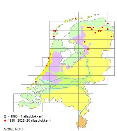 Het aantal atlasblokken (5x5 km) waarin de soort is gemeld binnen een periode van vijf jaar (vanaf 1980) of twintig jaar. Niet gecorrigeerd voor waarnemersinspanning en het aantal doorgegeven waarnemingen kan sterk variëren per periode, dus een trend in verspreiding kan hier niet direct uit worden afgelezen. Het opgegeven jaartal is het eerste jaar van de periode. Bron: gevalideerde waarnemingen uit de NDFF.