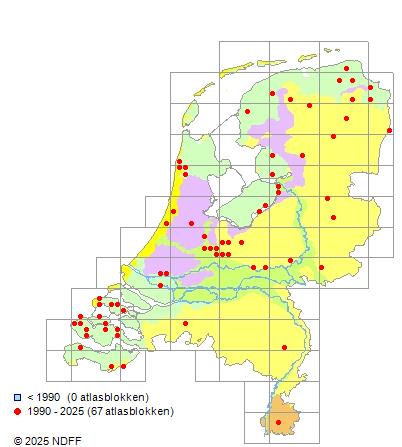 Het aantal atlasblokken (5x5 km) waarin de soort is gemeld binnen een periode van vijf jaar (vanaf 1980) of twintig jaar. Niet gecorrigeerd voor waarnemersinspanning en het aantal doorgegeven waarnemingen kan sterk variëren per periode, dus een trend in verspreiding kan hier niet direct uit worden afgelezen. Het opgegeven jaartal is het eerste jaar van de periode. Bron: gevalideerde waarnemingen uit de NDFF.