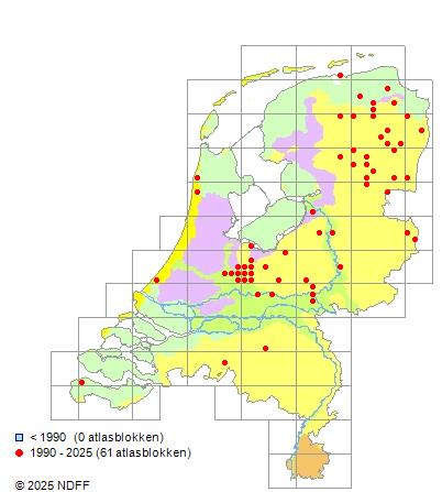 Het aantal atlasblokken (5x5 km) waarin de soort is gemeld binnen een periode van vijf jaar (vanaf 1980) of twintig jaar. Niet gecorrigeerd voor waarnemersinspanning en het aantal doorgegeven waarnemingen kan sterk variëren per periode, dus een trend in verspreiding kan hier niet direct uit worden afgelezen. Het opgegeven jaartal is het eerste jaar van de periode. Bron: gevalideerde waarnemingen uit de NDFF.