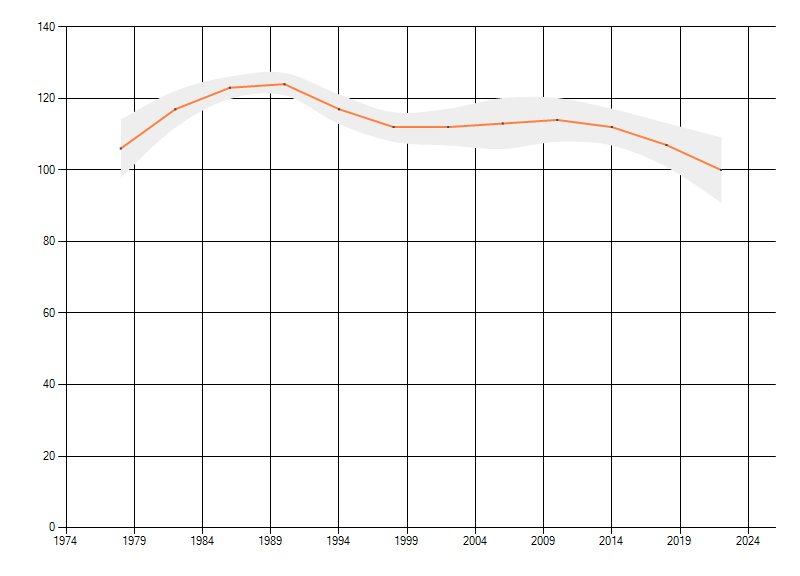 Gemiddelde trend van het aantal kilometerhokken waarin de soort voorkomt, weergegeven als indexcijfer (1975-1978 = 100).