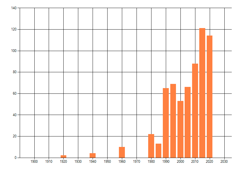 Het aantal atlasblokken (5x5 km) waarin de soort is gemeld binnen een periode van vijf jaar (vanaf 1980) of twintig jaar. Niet gecorrigeerd voor waarnemersinspanning en het aantal doorgegeven waarnemingen kan sterk variëren per periode, dus een trend in verspreiding kan hier niet direct uit worden afgelezen. Het opgegeven jaartal is het eerste jaar van de periode. Bron: gevalideerde waarnemingen uit de NDFF.