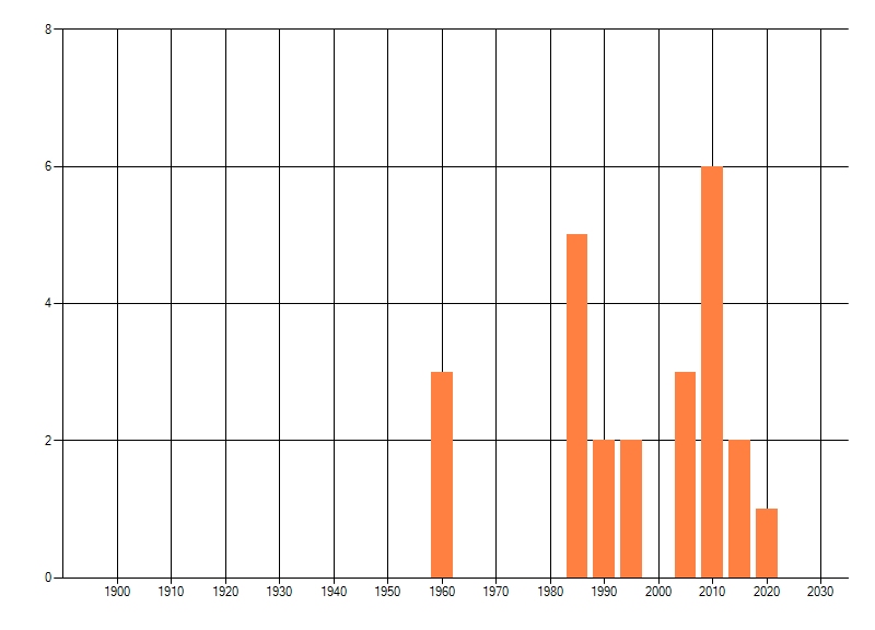 Het aantal atlasblokken (5x5 km) waarin de soort is gemeld binnen een periode van vijf jaar (vanaf 1980) of twintig jaar. Niet gecorrigeerd voor waarnemersinspanning en het aantal doorgegeven waarnemingen kan sterk variëren per periode, dus een trend in verspreiding kan hier niet direct uit worden afgelezen. Het opgegeven jaartal is het eerste jaar van de periode. Bron: gevalideerde waarnemingen uit de NDFF.