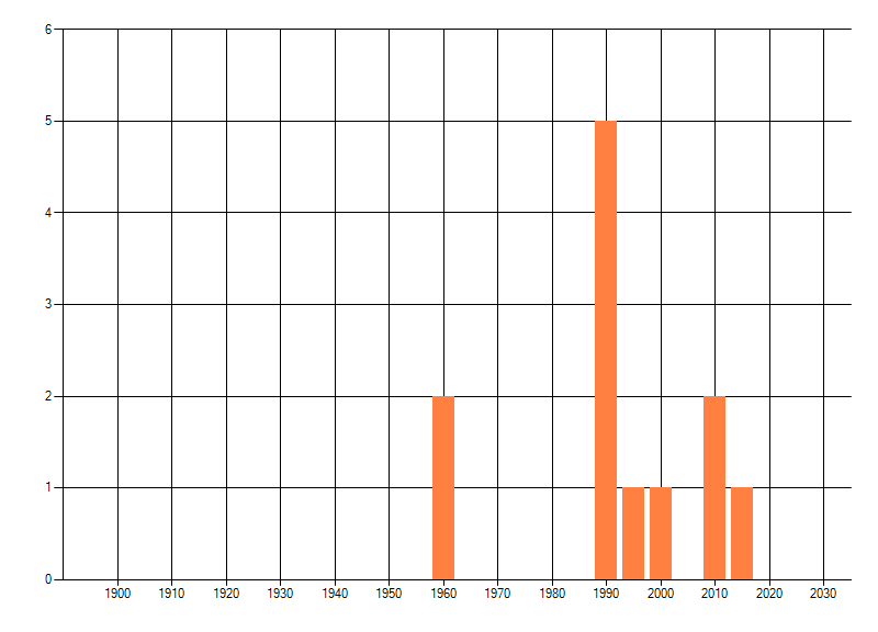 Het aantal atlasblokken (5x5 km) waarin de soort is gemeld binnen een periode van vijf jaar (vanaf 1980) of twintig jaar. Niet gecorrigeerd voor waarnemersinspanning en het aantal doorgegeven waarnemingen kan sterk variëren per periode, dus een trend in verspreiding kan hier niet direct uit worden afgelezen. Het opgegeven jaartal is het eerste jaar van de periode. Bron: gevalideerde waarnemingen uit de NDFF.