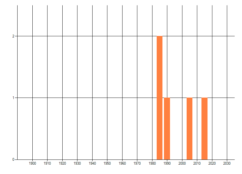 Het aantal atlasblokken (5x5 km) waarin de soort is gemeld binnen een periode van vijf jaar (vanaf 1980) of twintig jaar. Niet gecorrigeerd voor waarnemersinspanning en het aantal doorgegeven waarnemingen kan sterk variëren per periode, dus een trend in verspreiding kan hier niet direct uit worden afgelezen. Het opgegeven jaartal is het eerste jaar van de periode. Bron: gevalideerde waarnemingen uit de NDFF.