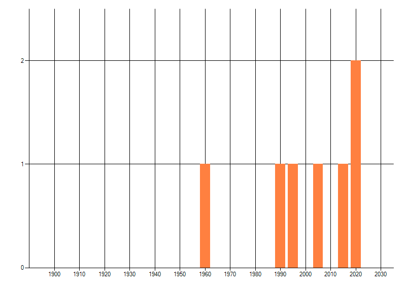 Het aantal atlasblokken (5x5 km) waarin de soort is gemeld binnen een periode van vijf jaar (vanaf 1980) of twintig jaar. Niet gecorrigeerd voor waarnemersinspanning en het aantal doorgegeven waarnemingen kan sterk variëren per periode, dus een trend in verspreiding kan hier niet direct uit worden afgelezen. Het opgegeven jaartal is het eerste jaar van de periode. Bron: gevalideerde waarnemingen uit de NDFF.