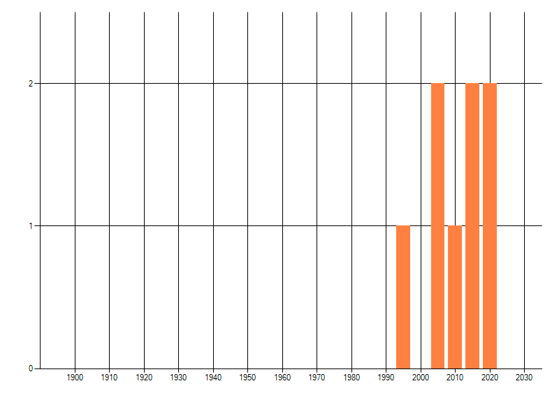 Het aantal atlasblokken (5x5 km) waarin de soort is gemeld binnen een periode van vijf jaar (vanaf 1980) of twintig jaar. Niet gecorrigeerd voor waarnemersinspanning en het aantal doorgegeven waarnemingen kan sterk variëren per periode, dus een trend in verspreiding kan hier niet direct uit worden afgelezen. Het opgegeven jaartal is het eerste jaar van de periode. Bron: gevalideerde waarnemingen uit de NDFF.