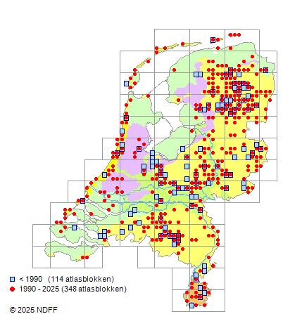 Het aantal atlasblokken (5x5 km) waarin de soort is gemeld binnen een periode van vijf jaar (vanaf 1980) of twintig jaar. Niet gecorrigeerd voor waarnemersinspanning en het aantal doorgegeven waarnemingen kan sterk variƫren per periode, dus een trend in verspreiding kan hier niet direct uit worden afgelezen. Het opgegeven jaartal is het eerste jaar van de periode. Bron: gevalideerde waarnemingen uit de NDFF.