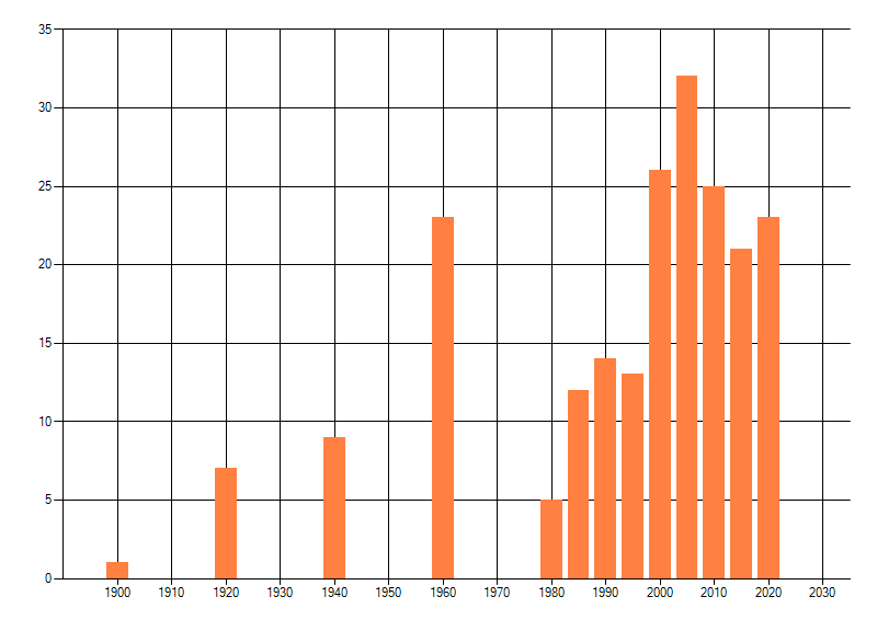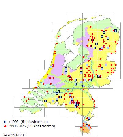 Het aantal atlasblokken (5x5 km) waarin de soort is gemeld binnen een periode van vijf jaar (vanaf 1980) of twintig jaar. Niet gecorrigeerd voor waarnemersinspanning en het aantal doorgegeven waarnemingen kan sterk variëren per periode, dus een trend in verspreiding kan hier niet direct uit worden afgelezen. Het opgegeven jaartal is het eerste jaar van de periode. Bron: gevalideerde waarnemingen uit de NDFF.