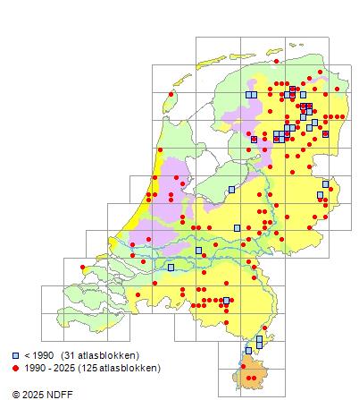Het aantal atlasblokken (5x5 km) waarin de soort is gemeld binnen een periode van vijf jaar (vanaf 1980) of twintig jaar. Niet gecorrigeerd voor waarnemersinspanning en het aantal doorgegeven waarnemingen kan sterk variëren per periode, dus een trend in verspreiding kan hier niet direct uit worden afgelezen. Het opgegeven jaartal is het eerste jaar van de periode. Bron: gevalideerde waarnemingen uit de NDFF.