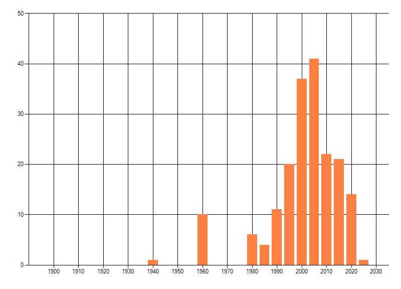 Het aantal atlasblokken (5x5 km) waarin de soort is gemeld binnen een periode van vijf jaar (vanaf 1980) of twintig jaar. Niet gecorrigeerd voor waarnemersinspanning en het aantal doorgegeven waarnemingen kan sterk variëren per periode, dus een trend in verspreiding kan hier niet direct uit worden afgelezen. Het opgegeven jaartal is het eerste jaar van de periode. Bron: gevalideerde waarnemingen uit de NDFF.