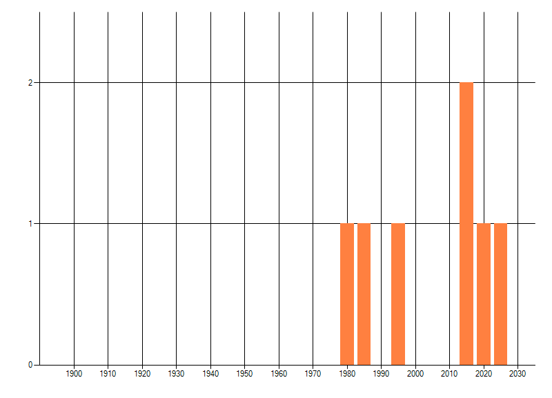 Het aantal atlasblokken (5x5 km) waarin de soort is gemeld binnen een periode van vijf jaar (vanaf 1980) of twintig jaar. Niet gecorrigeerd voor waarnemersinspanning en het aantal doorgegeven waarnemingen kan sterk variëren per periode, dus een trend in verspreiding kan hier niet direct uit worden afgelezen. Het opgegeven jaartal is het eerste jaar van de periode. Bron: gevalideerde waarnemingen uit de NDFF.