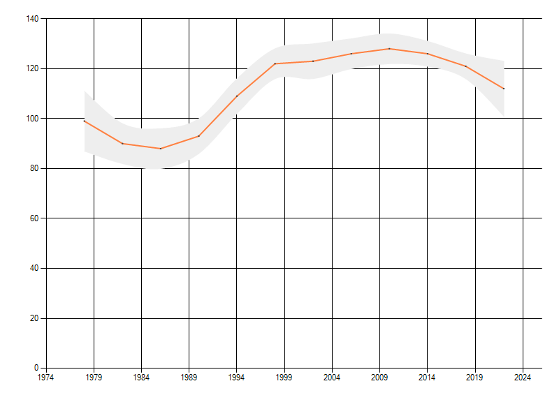 Gemiddelde trend van het aantal kilometerhokken waarin de soort voorkomt, weergegeven als indexcijfer (1975-1978 = 100).