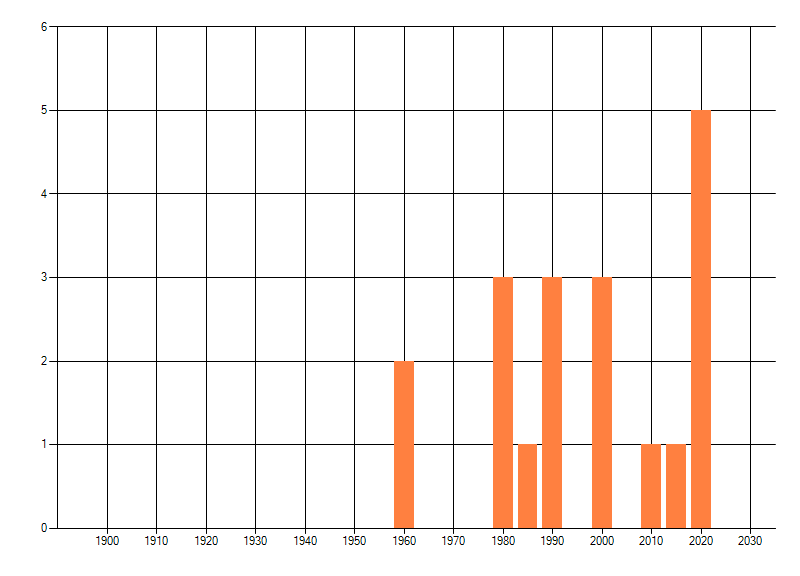 Het aantal atlasblokken (5x5 km) waarin de soort is gemeld binnen een periode van vijf jaar (vanaf 1980) of twintig jaar. Niet gecorrigeerd voor waarnemersinspanning en het aantal doorgegeven waarnemingen kan sterk variëren per periode, dus een trend in verspreiding kan hier niet direct uit worden afgelezen. Het opgegeven jaartal is het eerste jaar van de periode. Bron: gevalideerde waarnemingen uit de NDFF.