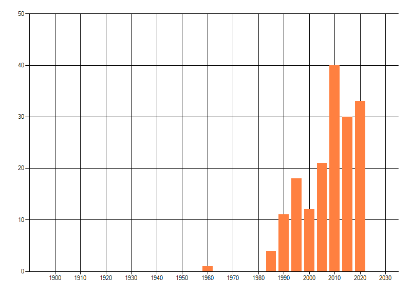 Het aantal atlasblokken (5x5 km) waarin de soort is gemeld binnen een periode van vijf jaar (vanaf 1980) of twintig jaar. Niet gecorrigeerd voor waarnemersinspanning en het aantal doorgegeven waarnemingen kan sterk variëren per periode, dus een trend in verspreiding kan hier niet direct uit worden afgelezen. Het opgegeven jaartal is het eerste jaar van de periode. Bron: gevalideerde waarnemingen uit de NDFF.
