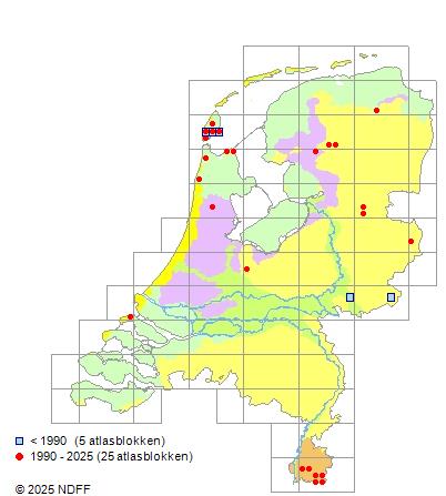 Het aantal atlasblokken (5x5 km) waarin de soort is gemeld binnen een periode van vijf jaar (vanaf 1980) of twintig jaar. Niet gecorrigeerd voor waarnemersinspanning en het aantal doorgegeven waarnemingen kan sterk variëren per periode, dus een trend in verspreiding kan hier niet direct uit worden afgelezen. Het opgegeven jaartal is het eerste jaar van de periode. Bron: gevalideerde waarnemingen uit de NDFF.