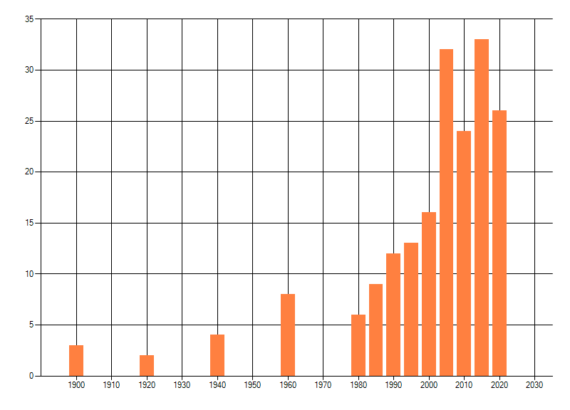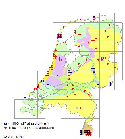 Het aantal atlasblokken (5x5 km) waarin de soort is gemeld binnen een periode van vijf jaar (vanaf 1980) of twintig jaar. Niet gecorrigeerd voor waarnemersinspanning en het aantal doorgegeven waarnemingen kan sterk variëren per periode, dus een trend in verspreiding kan hier niet direct uit worden afgelezen. Het opgegeven jaartal is het eerste jaar van de periode. Bron: gevalideerde waarnemingen uit de NDFF.
