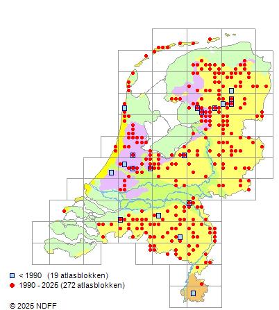 Het aantal atlasblokken (5x5 km) waarin de soort is gemeld binnen een periode van vijf jaar (vanaf 1980) of twintig jaar. Niet gecorrigeerd voor waarnemersinspanning en het aantal doorgegeven waarnemingen kan sterk variëren per periode, dus een trend in verspreiding kan hier niet direct uit worden afgelezen. Het opgegeven jaartal is het eerste jaar van de periode. Bron: gevalideerde waarnemingen uit de NDFF.