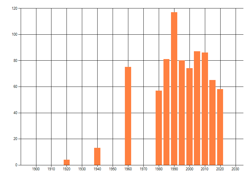 Het aantal atlasblokken (5x5 km) waarin de soort is gemeld binnen een periode van vijf jaar (vanaf 1980) of twintig jaar. Niet gecorrigeerd voor waarnemersinspanning en het aantal doorgegeven waarnemingen kan sterk variëren per periode, dus een trend in verspreiding kan hier niet direct uit worden afgelezen. Het opgegeven jaartal is het eerste jaar van de periode. Bron: gevalideerde waarnemingen uit de NDFF.