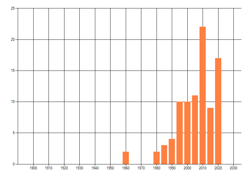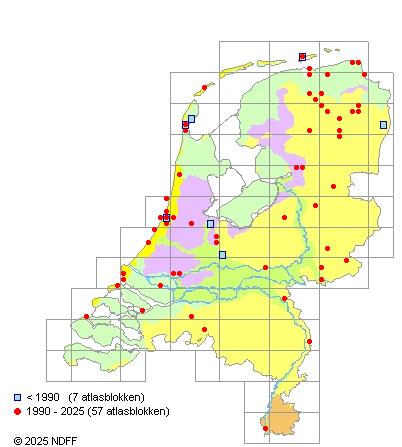 Het aantal atlasblokken (5x5 km) waarin de soort is gemeld binnen een periode van vijf jaar (vanaf 1980) of twintig jaar. Niet gecorrigeerd voor waarnemersinspanning en het aantal doorgegeven waarnemingen kan sterk variëren per periode, dus een trend in verspreiding kan hier niet direct uit worden afgelezen. Het opgegeven jaartal is het eerste jaar van de periode. Bron: gevalideerde waarnemingen uit de NDFF.