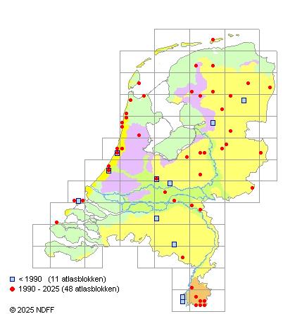 Het aantal atlasblokken (5x5 km) waarin de soort is gemeld binnen een periode van vijf jaar (vanaf 1980) of twintig jaar. Niet gecorrigeerd voor waarnemersinspanning en het aantal doorgegeven waarnemingen kan sterk variëren per periode, dus een trend in verspreiding kan hier niet direct uit worden afgelezen. Het opgegeven jaartal is het eerste jaar van de periode. Bron: gevalideerde waarnemingen uit de NDFF.