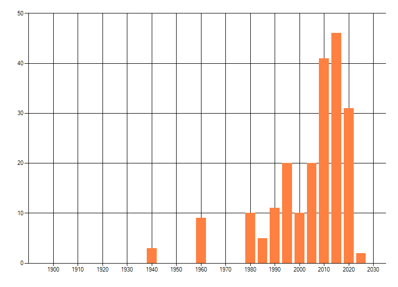 Het aantal atlasblokken (5x5 km) waarin de soort is gemeld binnen een periode van vijf jaar (vanaf 1980) of twintig jaar. Niet gecorrigeerd voor waarnemersinspanning en het aantal doorgegeven waarnemingen kan sterk variëren per periode, dus een trend in verspreiding kan hier niet direct uit worden afgelezen. Het opgegeven jaartal is het eerste jaar van de periode. Bron: gevalideerde waarnemingen uit de NDFF.