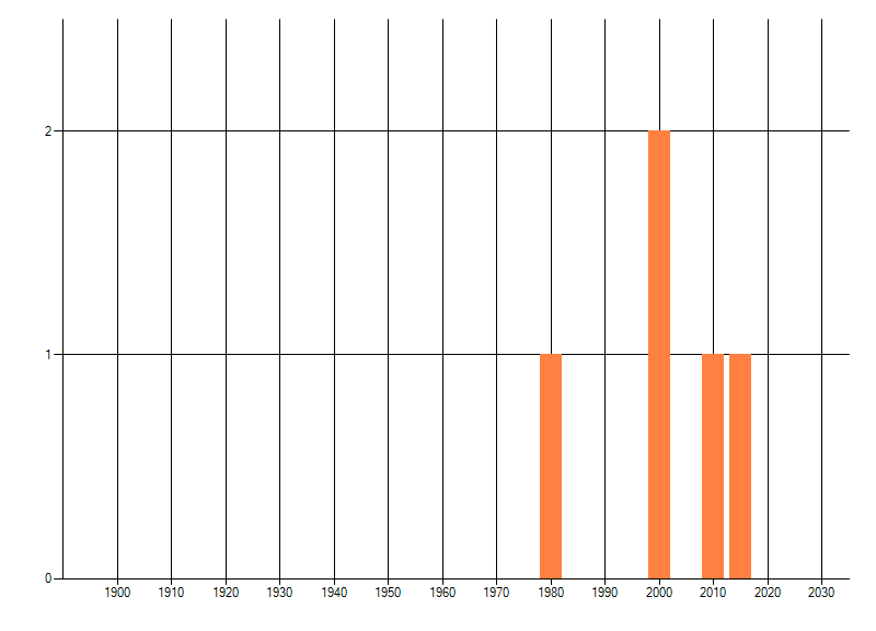 Het aantal atlasblokken (5x5 km) waarin de soort is gemeld binnen een periode van vijf jaar (vanaf 1980) of twintig jaar. Niet gecorrigeerd voor waarnemersinspanning en het aantal doorgegeven waarnemingen kan sterk variëren per periode, dus een trend in verspreiding kan hier niet direct uit worden afgelezen. Het opgegeven jaartal is het eerste jaar van de periode. Bron: gevalideerde waarnemingen uit de NDFF.