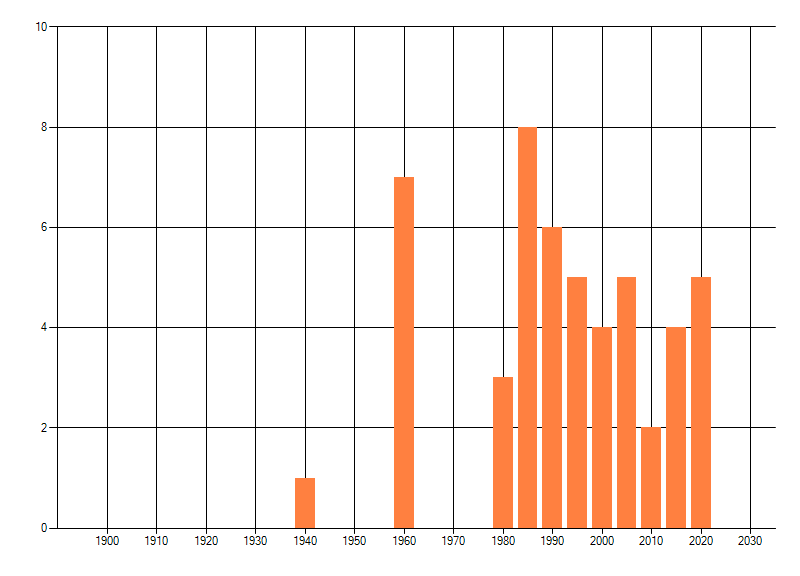 Het aantal atlasblokken (5x5 km) waarin de soort is gemeld binnen een periode van vijf jaar (vanaf 1980) of twintig jaar. Niet gecorrigeerd voor waarnemersinspanning en het aantal doorgegeven waarnemingen kan sterk variëren per periode, dus een trend in verspreiding kan hier niet direct uit worden afgelezen. Het opgegeven jaartal is het eerste jaar van de periode. Bron: gevalideerde waarnemingen uit de NDFF.