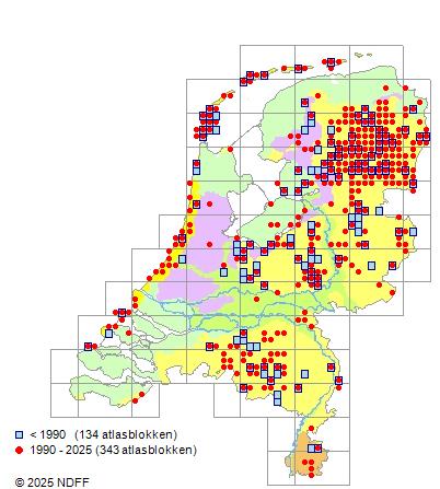 Het aantal atlasblokken (5x5 km) waarin de soort is gemeld binnen een periode van vijf jaar (vanaf 1980) of twintig jaar. Niet gecorrigeerd voor waarnemersinspanning en het aantal doorgegeven waarnemingen kan sterk variëren per periode, dus een trend in verspreiding kan hier niet direct uit worden afgelezen. Het opgegeven jaartal is het eerste jaar van de periode. Bron: gevalideerde waarnemingen uit de NDFF.