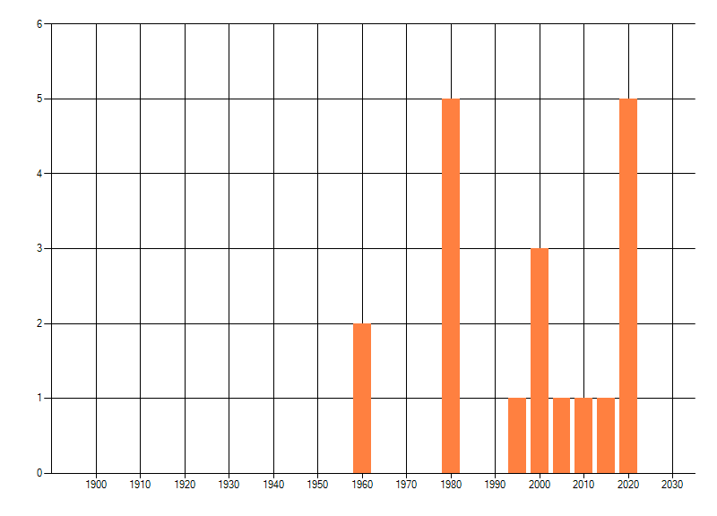 Het aantal atlasblokken (5x5 km) waarin de soort is gemeld binnen een periode van vijf jaar (vanaf 1980) of twintig jaar. Niet gecorrigeerd voor waarnemersinspanning en het aantal doorgegeven waarnemingen kan sterk variëren per periode, dus een trend in verspreiding kan hier niet direct uit worden afgelezen. Het opgegeven jaartal is het eerste jaar van de periode. Bron: gevalideerde waarnemingen uit de NDFF.