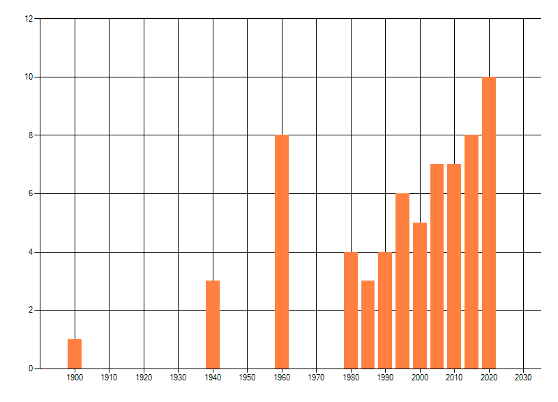 Het aantal atlasblokken (5x5 km) waarin de soort is gemeld binnen een periode van vijf jaar (vanaf 1980) of twintig jaar. Niet gecorrigeerd voor waarnemersinspanning en het aantal doorgegeven waarnemingen kan sterk variëren per periode, dus een trend in verspreiding kan hier niet direct uit worden afgelezen. Het opgegeven jaartal is het eerste jaar van de periode. Bron: gevalideerde waarnemingen uit de NDFF.