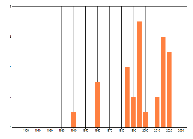 Het aantal atlasblokken (5x5 km) waarin de soort is gemeld binnen een periode van vijf jaar (vanaf 1980) of twintig jaar. Niet gecorrigeerd voor waarnemersinspanning en het aantal doorgegeven waarnemingen kan sterk variëren per periode, dus een trend in verspreiding kan hier niet direct uit worden afgelezen. Het opgegeven jaartal is het eerste jaar van de periode. Bron: gevalideerde waarnemingen uit de NDFF.