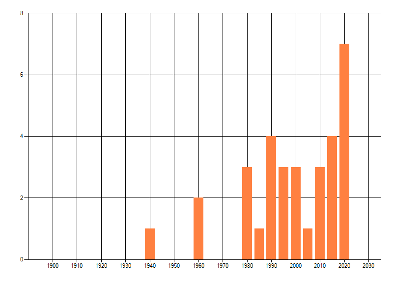 Het aantal atlasblokken (5x5 km) waarin de soort is gemeld binnen een periode van vijf jaar (vanaf 1980) of twintig jaar. Niet gecorrigeerd voor waarnemersinspanning en het aantal doorgegeven waarnemingen kan sterk variëren per periode, dus een trend in verspreiding kan hier niet direct uit worden afgelezen. Het opgegeven jaartal is het eerste jaar van de periode. Bron: gevalideerde waarnemingen uit de NDFF.