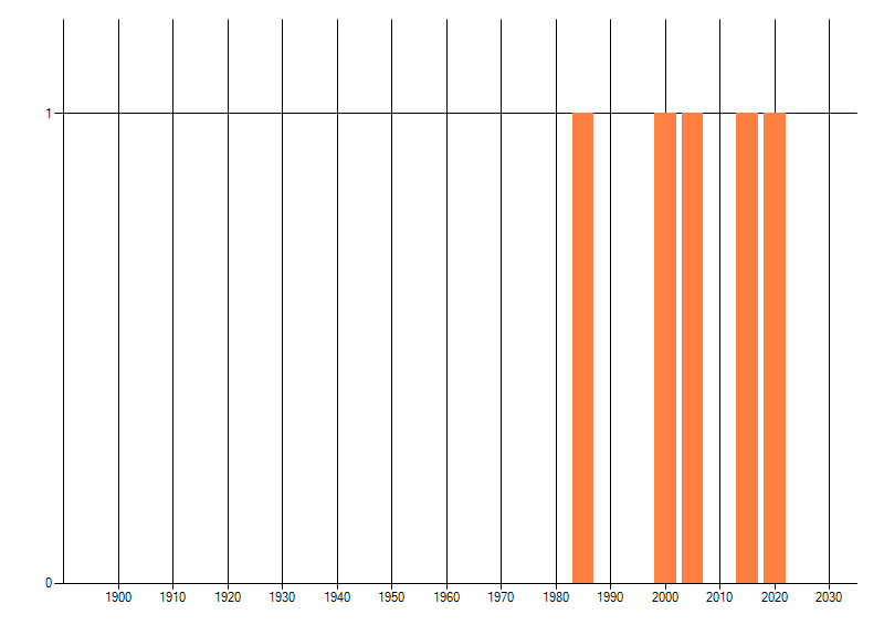 Het aantal atlasblokken (5x5 km) waarin de soort is gemeld binnen een periode van vijf jaar (vanaf 1980) of twintig jaar. Niet gecorrigeerd voor waarnemersinspanning en het aantal doorgegeven waarnemingen kan sterk variëren per periode, dus een trend in verspreiding kan hier niet direct uit worden afgelezen. Het opgegeven jaartal is het eerste jaar van de periode. Bron: gevalideerde waarnemingen uit de NDFF.