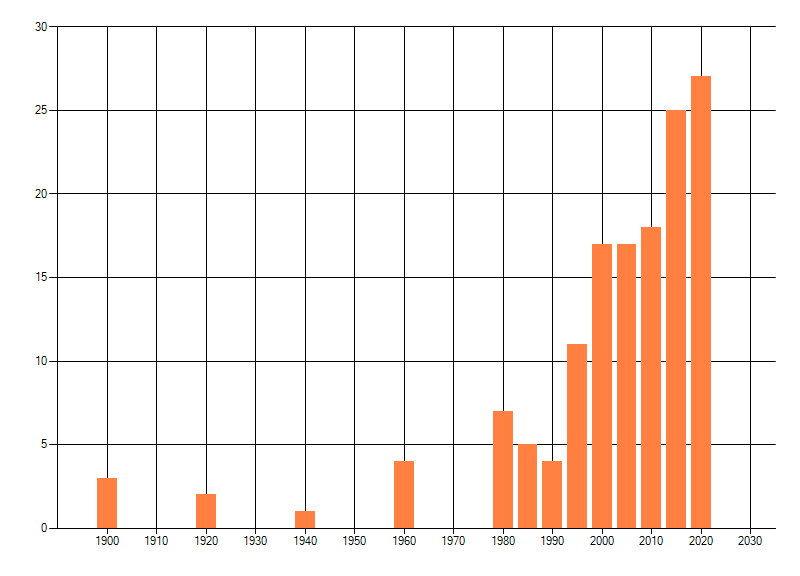 Het aantal atlasblokken (5x5 km) waarin de soort is gemeld binnen een periode van vijf jaar (vanaf 1980) of twintig jaar. Niet gecorrigeerd voor waarnemersinspanning en het aantal doorgegeven waarnemingen kan sterk variëren per periode, dus een trend in verspreiding kan hier niet direct uit worden afgelezen. Het opgegeven jaartal is het eerste jaar van de periode. Bron: gevalideerde waarnemingen uit de NDFF.