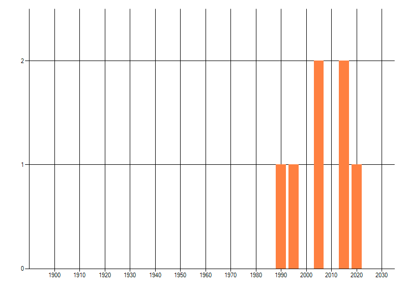 Het aantal atlasblokken (5x5 km) waarin de soort is gemeld binnen een periode van vijf jaar (vanaf 1980) of twintig jaar. Niet gecorrigeerd voor waarnemersinspanning en het aantal doorgegeven waarnemingen kan sterk variëren per periode, dus een trend in verspreiding kan hier niet direct uit worden afgelezen. Het opgegeven jaartal is het eerste jaar van de periode. Bron: gevalideerde waarnemingen uit de NDFF.