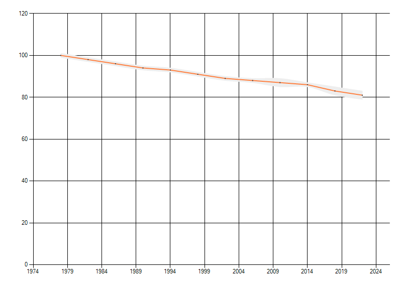 Gemiddelde trend van het aantal kilometerhokken waarin de soort voorkomt, weergegeven als indexcijfer (1975-1978 = 100).