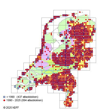 Het aantal atlasblokken (5x5 km) waarin de soort is gemeld binnen een periode van vijf jaar (vanaf 1980) of twintig jaar. Niet gecorrigeerd voor waarnemersinspanning en het aantal doorgegeven waarnemingen kan sterk variëren per periode, dus een trend in verspreiding kan hier niet direct uit worden afgelezen. Het opgegeven jaartal is het eerste jaar van de periode. Bron: gevalideerde waarnemingen uit de NDFF.