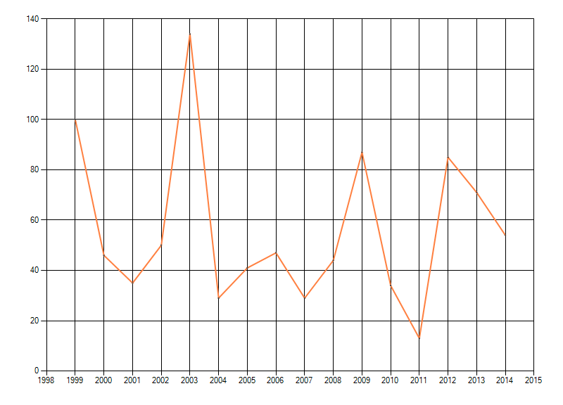 Trend in het geschatte aantal individuen van paddenstoelen in bossen op de hoge zandgronden, weergegeven als indexcijfer (eerste jaar = 100). Bron: