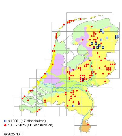 Het aantal atlasblokken (5x5 km) waarin de soort is gemeld binnen een periode van vijf jaar (vanaf 1980) of twintig jaar. Niet gecorrigeerd voor waarnemersinspanning en het aantal doorgegeven waarnemingen kan sterk variëren per periode, dus een trend in verspreiding kan hier niet direct uit worden afgelezen. Het opgegeven jaartal is het eerste jaar van de periode. Bron: gevalideerde waarnemingen uit de NDFF.
