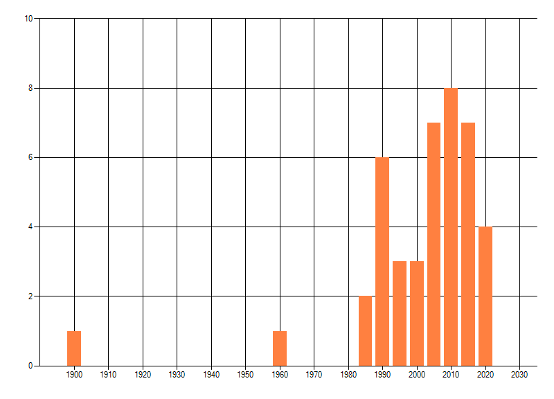 Het aantal atlasblokken (5x5 km) waarin de soort is gemeld binnen een periode van vijf jaar (vanaf 1980) of twintig jaar. Niet gecorrigeerd voor waarnemersinspanning en het aantal doorgegeven waarnemingen kan sterk variëren per periode, dus een trend in verspreiding kan hier niet direct uit worden afgelezen. Het opgegeven jaartal is het eerste jaar van de periode. Bron: gevalideerde waarnemingen uit de NDFF.