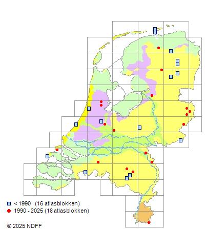 Het aantal atlasblokken (5x5 km) waarin de soort is gemeld binnen een periode van vijf jaar (vanaf 1980) of twintig jaar. Niet gecorrigeerd voor waarnemersinspanning en het aantal doorgegeven waarnemingen kan sterk variëren per periode, dus een trend in verspreiding kan hier niet direct uit worden afgelezen. Het opgegeven jaartal is het eerste jaar van de periode. Bron: gevalideerde waarnemingen uit de NDFF.
