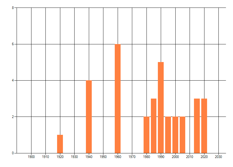 Het aantal atlasblokken (5x5 km) waarin de soort is gemeld binnen een periode van vijf jaar (vanaf 1980) of twintig jaar. Niet gecorrigeerd voor waarnemersinspanning en het aantal doorgegeven waarnemingen kan sterk variëren per periode, dus een trend in verspreiding kan hier niet direct uit worden afgelezen. Het opgegeven jaartal is het eerste jaar van de periode. Bron: gevalideerde waarnemingen uit de NDFF.
