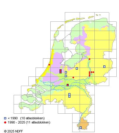 Zeld., voornamelijk in F; zeer zeld. in S, G, K en Z. Sterk achteruitgegaan en sinds 1980 slechts van vier plaatsen bekend. Kaart in Nauta & Vellinga, Atlas. 1995.