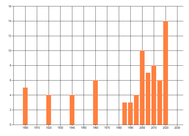 Het aantal atlasblokken (5x5 km) waarin de soort is gemeld binnen een periode van vijf jaar (vanaf 1980) of twintig jaar. Niet gecorrigeerd voor waarnemersinspanning en het aantal doorgegeven waarnemingen kan sterk variëren per periode, dus een trend in verspreiding kan hier niet direct uit worden afgelezen. Het opgegeven jaartal is het eerste jaar van de periode. Bron: gevalideerde waarnemingen uit de NDFF.