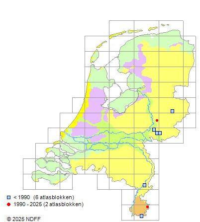 Vroeger zeer zeld. (Delden, Twickel; Hummelo, Hoog-Keppel; Doetinchem, Slangenburg; Roermond; Epen, Bovenste Bos). Laatste waarneming uit 1974. Kaart in Nauta & Vellinga, Atlas. 1995.
